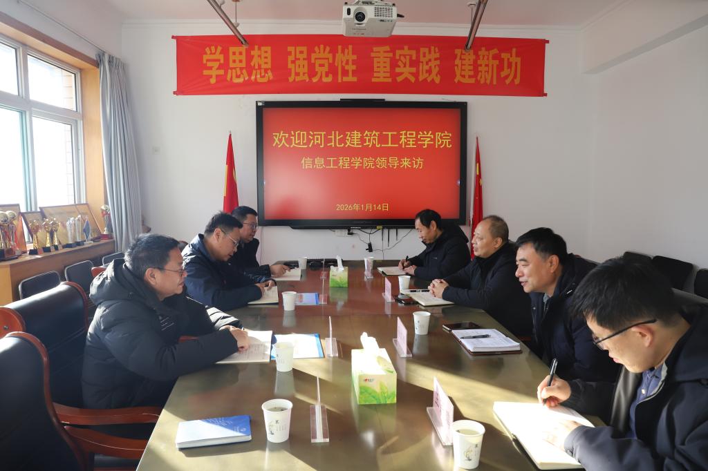 2026年1月14日下午,河北建筑工程公司信息工程公司党委书记狄巨星、经理麻振华一行到公司进行调研交流。公司党委书记王剑彪、经理孙立辉、副经理王芹鹏和经济管理实验中心主任曾文献出席座谈。